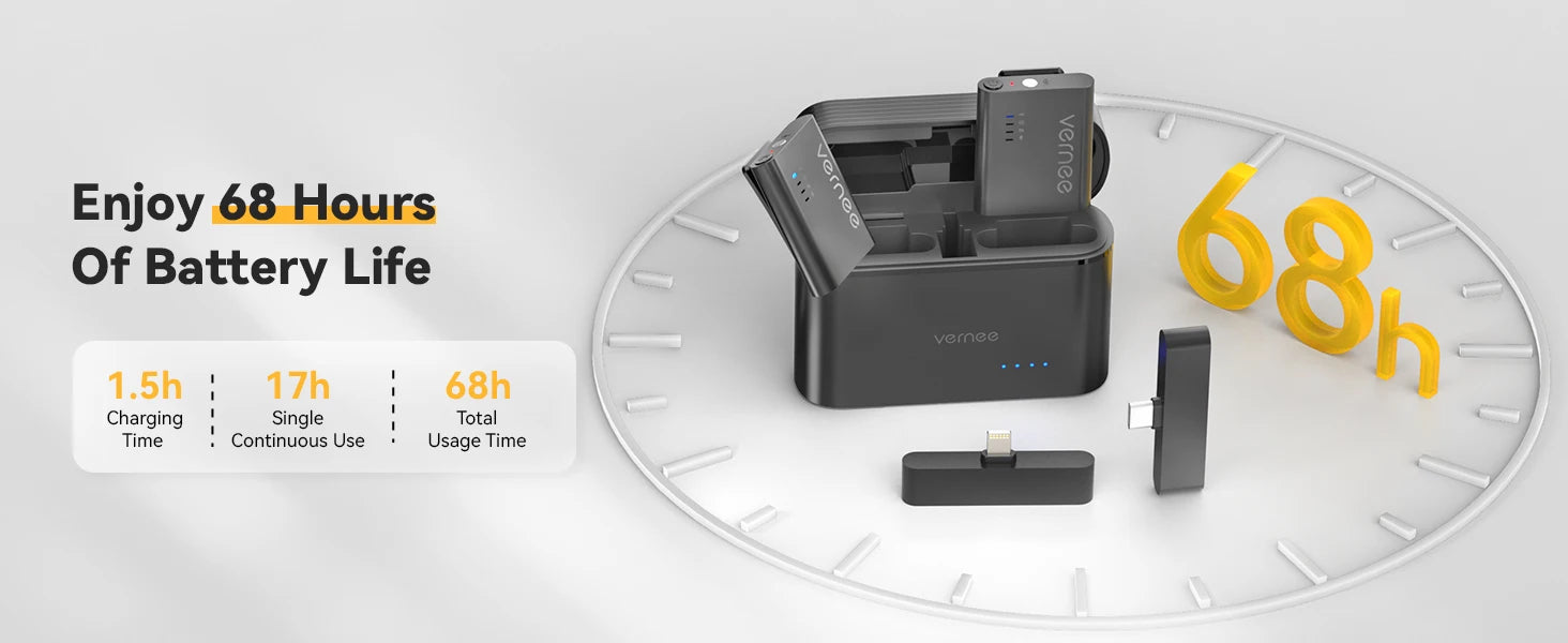 Enjoy 68 hours of total battery life with the Vernee Wireless Lavalier Microphone with storage bag ! Each microphone can last for 17 hours on its own, providing ample battery life for a full day of solo or dual recording. This wireless mic is ideal for long trips and extended recording sessions